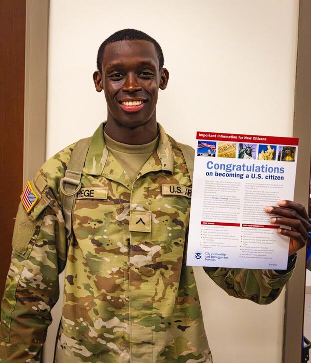 A U.S. Army Soldier with Delta Company, 2nd Battalion, 58th Infantry Regiment, 198th Infantry Brigade becomes a naturalized citizen during his time in Infantry One Station Unit Training April 18, 2024, on Fort Moore, Georgia. The U.S. Citizenship and Immigration Services provides an expedited naturalization process to non-citizen military service members. (U.S. Army photo by Capt. Stephanie Snyder)
