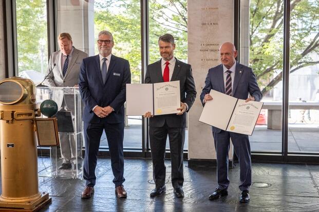 U.S. Senators Todd Young, senator of Indiana and Marine Corps veteran, and Mark Kelly, senator of Arizona and retired NASA astronaut are presented certificates during an awards ceremony at the Reserve Organization of America Building Washington, D.C., Sep. 3, 2025. The National Capital Council Navy League hosted the Congressional Sea Services Award ceremony in honor of U.S. Senators Todd Young and Mark Kelly for their outstanding contributions to the Sea Services in the previous calendar year. U.S. Marine Corps photo by Lance Cpl. Joshua Bustamante. Source: DVIDS