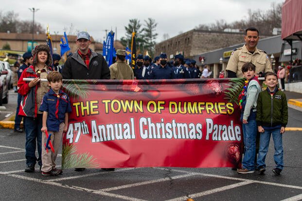 Members of Boy Scouts of America Troop 176, Quantico Scouts, lead the parade during the Town of Dumfries 47th Annual Christmas Parade in Dumfries, Virginia, Dec. 11, 2021. (U.S. Marine Corps Photo by Lance Corporal Mitchell Johnson)