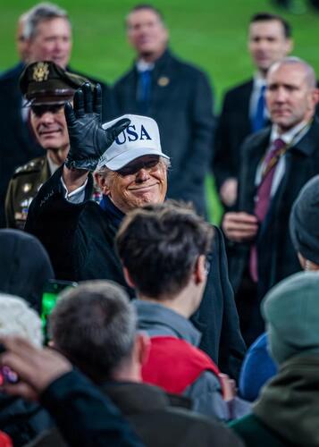 President Donald J. Trump on the field during the Army-Navy football game at M&T Bank Stadium in Baltimore, Maryland, Dec. 13, 2025. U.S. Army photo by Spc. Matthew Keegan. Source: DVIDS