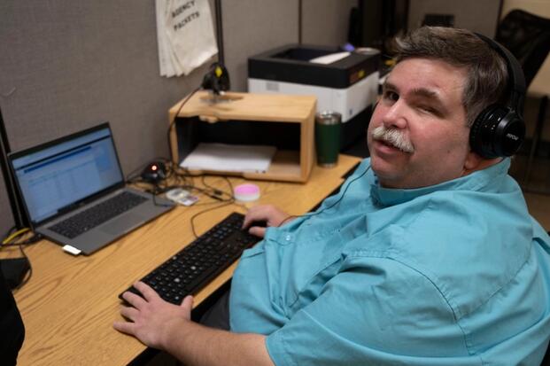 David Miller prints releases with JAWS software and the L3 system with a barcode reader at the Boyers mailroom. Miller is among personnel with disabilities supporting the Defense Counterintelligence and Security Agency (DCSA) in Boyers, Pa., via an AbilityOne contract to accomplish a vital mission. (Photo by Christopher Gillis, DVIDS)