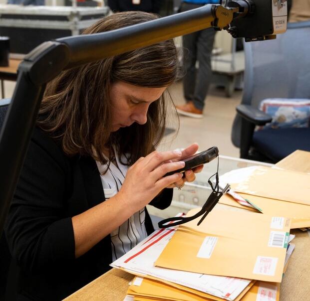 Heather Presnar conducts case processing using an Acrobat Arm to scan mail with a UPS Trackpad handheld. Presnar is among personnel supporting the Defense Counterintelligence and Security Agency (DCSA) in Boyers, Pa., via an AbilityOne contract to accomplish a vital mission despite their various disabilities. (Photo by Christopher Gillis, DVIDS)