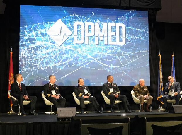 Dr. Darrin Frye (right), chief science director, Naval Medical Research Unit (NAMRU) San Antonio, served as a panelist on a continuing education panel titled, “Overcoming the Unique Medical Challenges across the Indo-Pacific Theater during the 2026 Annual Operational Medicine Symposium (OpMed) & Technology Showcase held at the Henry B. Gonzales Convention Center. (U.S. Navy photo by Burrell Parmer, NAMRU San Antonio Public Affairs/Released, DVIDS)