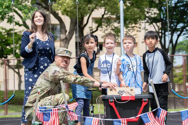 Space Force Lt. Col. Kaoru Elliott, second from left, U.S. Space Forces-Japan deputy commander, and Nikki Palmer, Space Systems Command chief engineer, watch model rocket launches with Yokota West Elementary School students during a STEM outreach event at Yokota Air Base, Japan, May 15, 2025. (Photo by Airman 1st Class David S. Calcot, DoW)