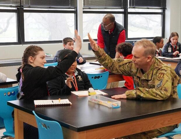 Brig. Gen. Jason E. Bartolomei, Air Force Research Laboratory commander, high-fives students as they prepare for an egg drop competition during a visit to DoD STARBASE Wright-Patt in Dayton, Ohio, April 11, 2025. STARBASE is a Department of Defense K-12 STEM program managed by the Wright-Patterson Education Outreach Office, that provides local students access to hands-on learning and military mentorship. (Photo by April M. Morton, DVIDS)