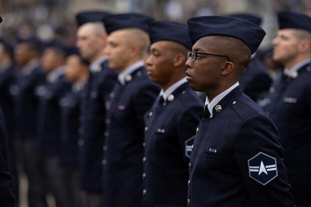 Space Force guardians from Flights 057-063 stand at parade rest during a graduation ceremony from Basic Military Training at Joint Base San Antonio-Lackland, Texas, Dec. 18, 2025. Guardians wore the new Space Force service dress uniform for the first time at a BMT graduation. (Jonathan R. Mallard/Air Force)