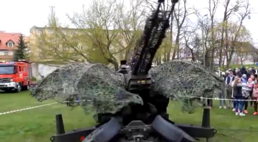 Romanian soldiers from Battle Group Poland’s Blue Scorpions demonstrate their firing drill for the Oerlikon GDF anti-aircraft canon during Orzysz