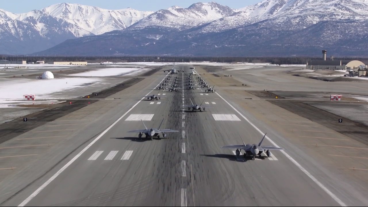 F-22 Raptors from the 3rd Wing and 477th Fighter Group participate in a close formation taxi, known as an Elephant