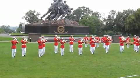 The Marine Corps Drum and Bugle Corps perform the Sunset Parade at the Iwo Jima Memorial in Washington DC on