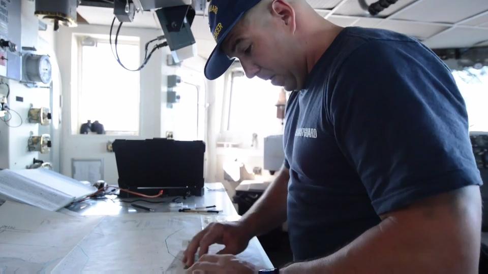 Petty Officer 2nd Class John Gross, a navigator of the watch aboard the Coast Guard Cutter Spencer, ensures the safe