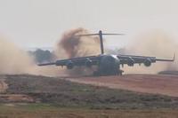 An U.S. Air Force C-17 Globemaster III lands at Fort Bragg, North Carolina, and unloads two AH-64 Apache helicopters. Following