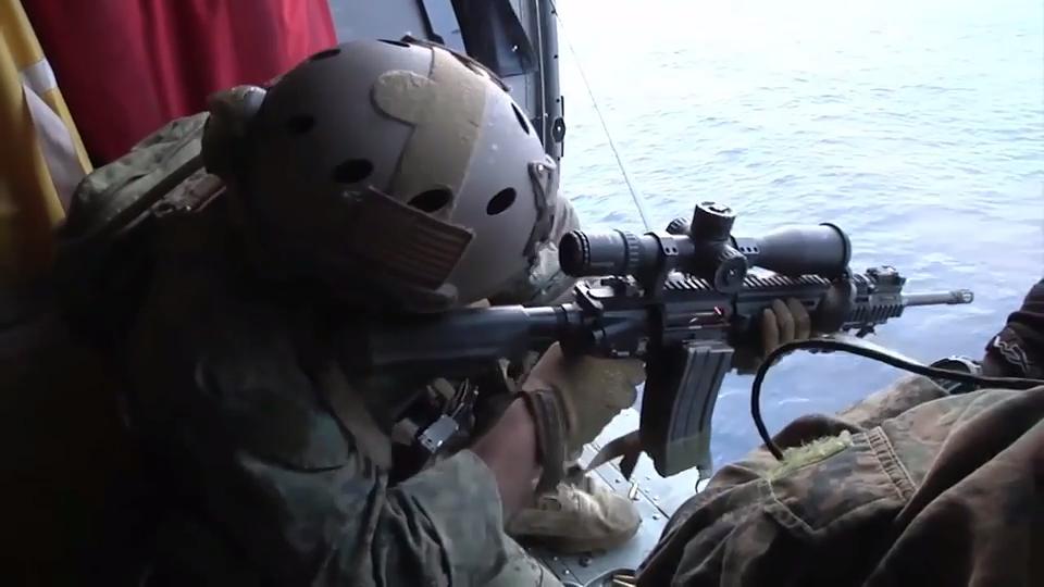 U.S. Marine Corps Snipers shoot targets from an MH-60 Seahawk helicopter on March 30, 2017.