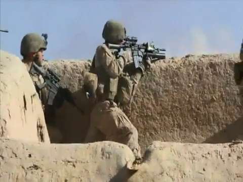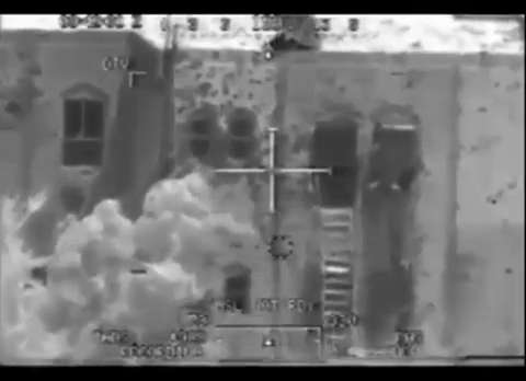Video of Apache helicopters engaging a building with a possible weapon cache. Scenes include gun camera footage of a building