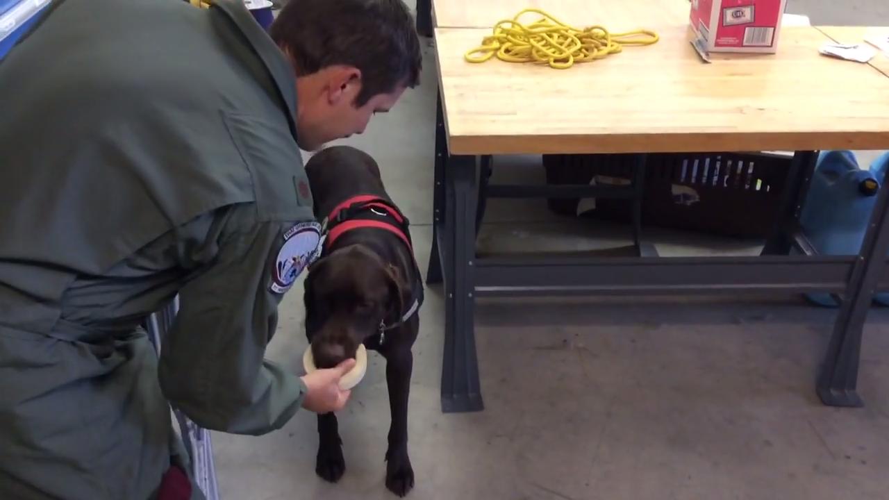 TOML, a service dog with the Alaska Air National Guard's 212th Rescue Squadron, is believed to be the first of