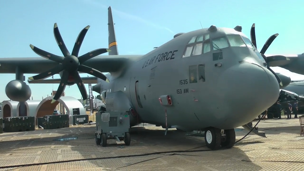 The U.S. military contingent at this year's Farnborough Air Show includes an F-15E, an AH-64 Apache helicopter, a C-130J, and