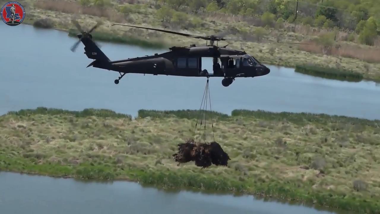 Louisiana National Guardsmen from 1st Assault Helicopter Battalion, 244th Aviation Regiment, hook up Christmas trees to a UH-60 Black Hawk