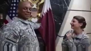 American Soldiers Laugh in Front of Qatar Flag
