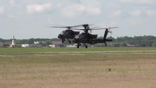 A simultaneous synchronized launch of fourteen AH-64D Apache Attack Helicopters from the South Carolina Army National Guard at McEntire Joint