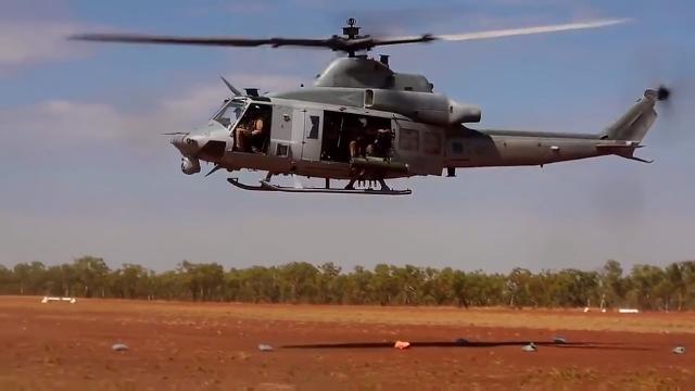 GoPro view of a U.S. Marine Corps UH-1Y Super Huey helicopter firing Hydra 70 Rockets during Exercise Koolendong 16 at