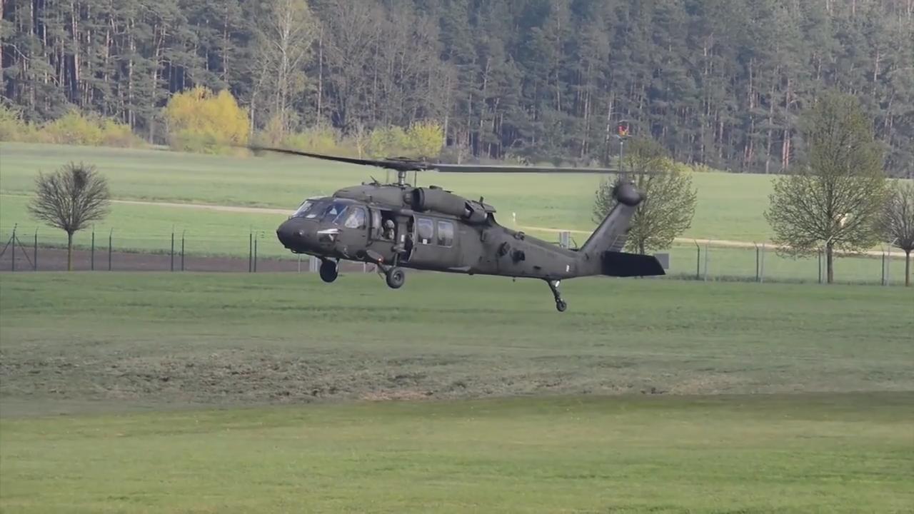 A U.S. Army UH-60 Black Hawk helicopter from the 10th Mountain Division's 10th Combat Aviation Brigade from Fort Drum New