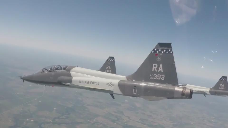 Several Northrop T-38 Talon jet trainers fly in close formation flight over the state of Georgia.