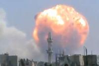 An SAA parachute bomb drops in front of a civilian cameraman and explodes moments later in a Syrian residential area