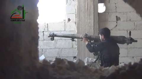 The Free Syrian Army uses a B-10 to engage SAA sniper position in Daraya.