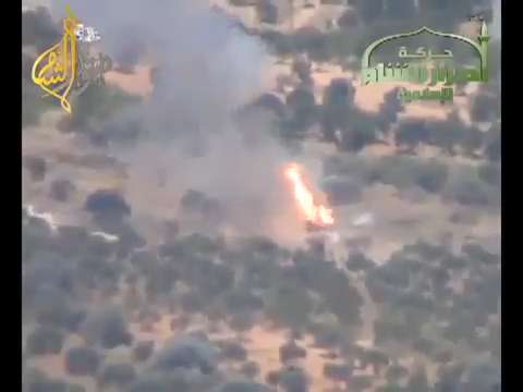 A Syrian Army tank is engaged with a concourse missile by FSA rebels at the Minnigh Military Airport. 06/14/2013.