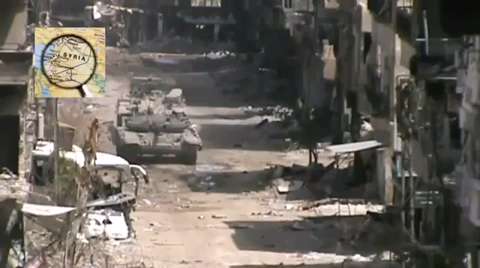 A Syrian Army T-72 tank sends a greeting card to a member of the FSA who is recording them. 04/14/2013.
