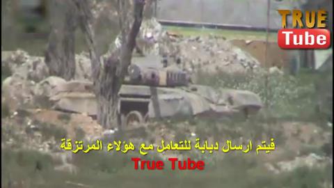Syrian rebels engage an SAA T-90 tank with an RPG. The SAA returns the favor with a barrage of attacks