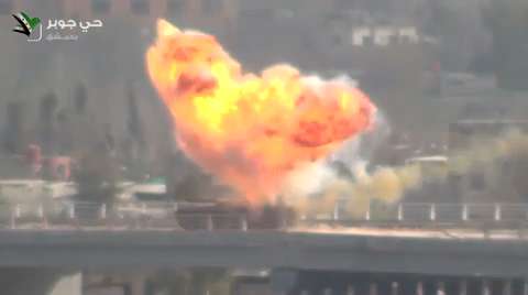 The Free Syrian Army blows up a Syrian Arab Army tank that was trying to restore power of the Harmala