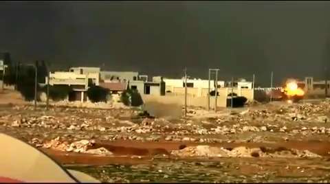 Syrian rebel tank rolls up on and engages a Syrian Army tank. 11/05/2012.