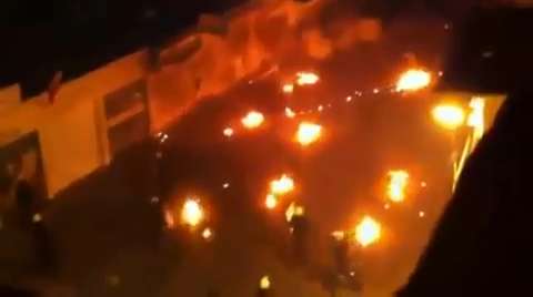 Bahrain - Protesters attack police with their weapon of choice, the molotov cocktail. It's literally raining down on them.