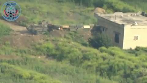 22 APR 2015 – A Syrian Arab Army tank crew tries to defend itself against a TOW missile by firing