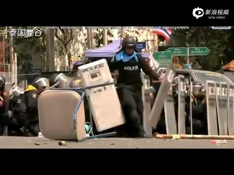 A Thai police officer mistakingly kicks a live grenade during protests with disasterous results.