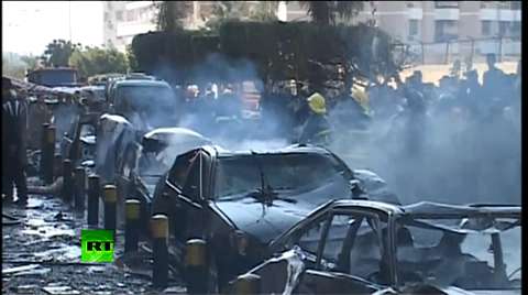 A Syrian rebel from the Alfatihine Brigade is incinerated by a bazooka that backfires.