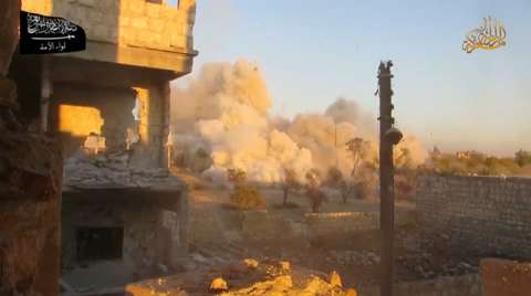 Syrian regime forces conduct an artillery strike on a Syrian rebel stronghold and completely wipeout an FSA occupied building.