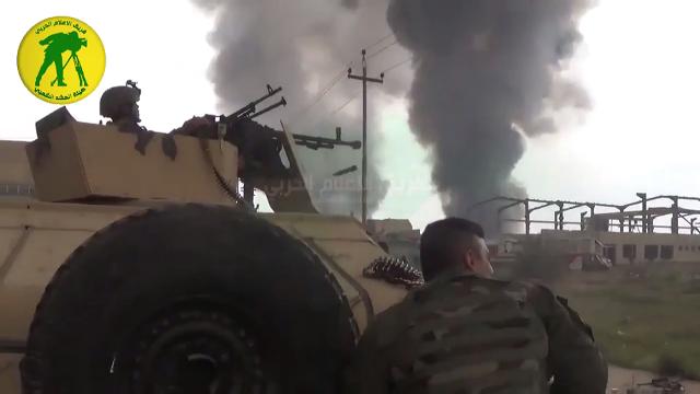 Footage shows extremists firing machine guns at government troops from behind an armoured vehicle in Hama, in western Syria. Seconds