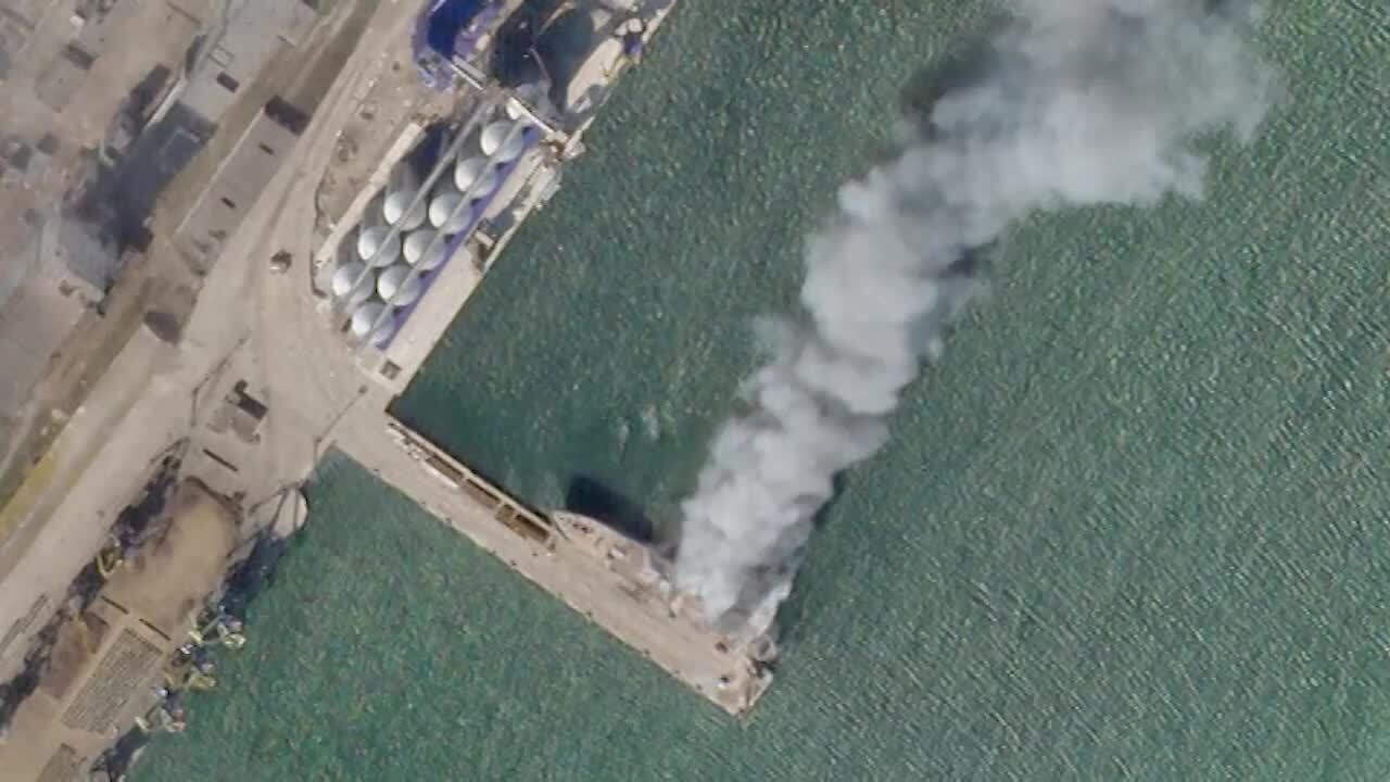 A Ukrainian naval vessel caught fire in unknown circumstances in Mariupol port, satellite photos analyzed by The Associated Press show