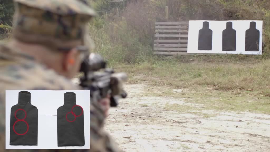 U.S. Marines, CWO5 Christian Wade, 2nd Marine Division Gunner, and Cpl Gerald Tredo, 3/6 infantryman, compare shot groups while firing