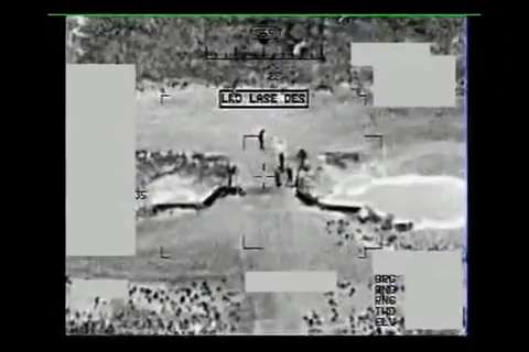 B-roll of aerial gun tape vehicle engagement. Scenes include Apache helicopter identifying and engaging vehicles with hellfire missiles and 30mm