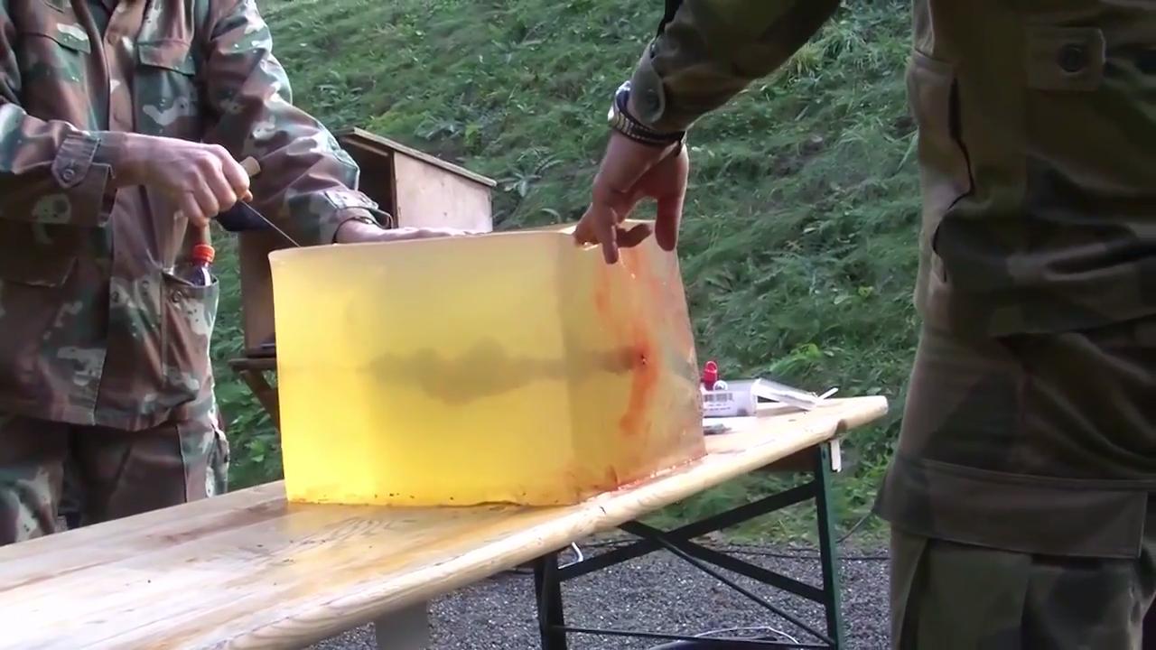 German Soldiers shoot an assortment of firearms into ballistics gelatin to study the effects of bullet wounds on the human