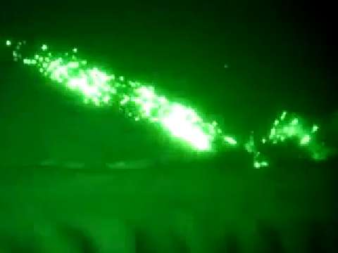 Thermal imaging of the 40-mm gun station of an AC-130 Spectre gunship over Afghanistan. In the course of the video