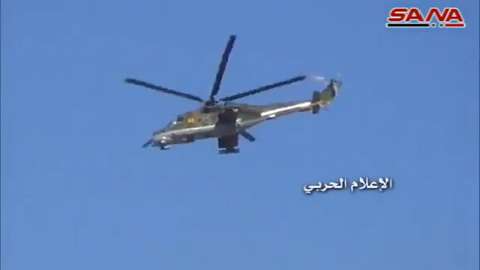 Russian Hind’s attack helicopters provide air support to Syrian ground forces against ISIS near Palmyra, Syria.