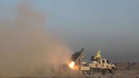 Kataib Hezbollah forces attack ISIS positions in Iraq with an IRAM rocket launcher.