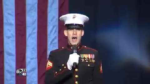 A U.S. Marine sings the national anthem before a speech by Donald Trump in Birmingham.