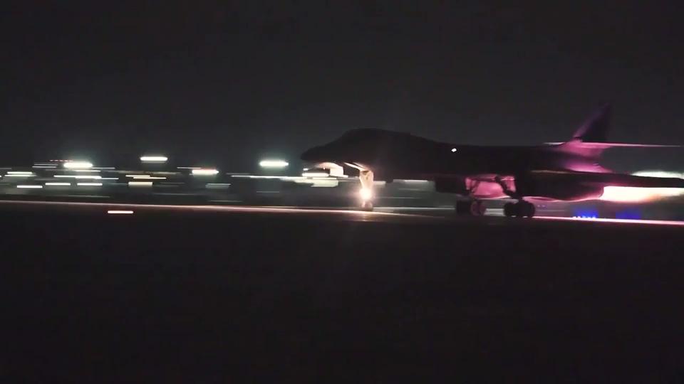 Two U.S. Air Force B-1B Lancer bombers takeoff at night, with afterburners blazing, from Andersen Air Force Base, Guam on