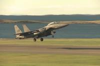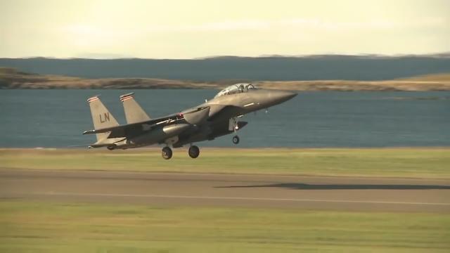 RAF Lakenheath's F-15Cs and Strike Eagles, the Norweigan F-16 Falcon, Sweden's JAS-39 Gripen, and the Finnish F-18 Hornet take off