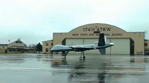 An MQ-9 Reaper operated by the New York Air National Guard lands and taxis at the Syracuse International Airport.