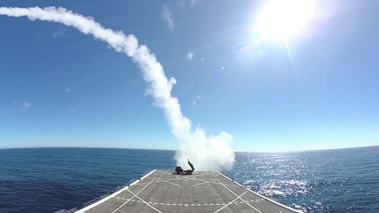 U.S. Marines launch a rocket from a High Mobility Artillery Rocket System (HIMARS) off the USS Anchorage (LPD-23) during Exercise